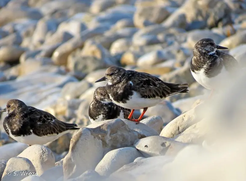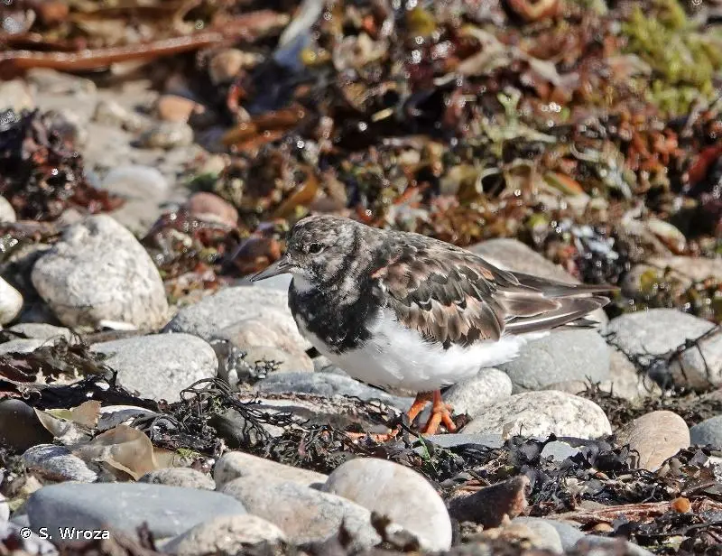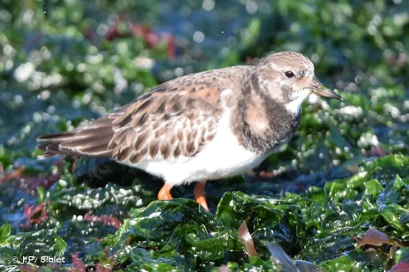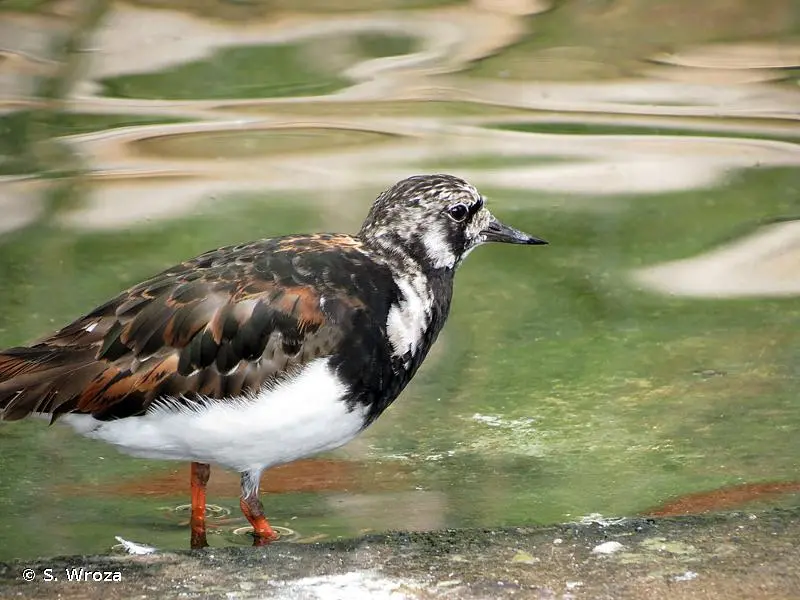 Corps trapu aux pattes courtes rouge-orange et au bec court noir. Dessus noir rayé de roux avec des pointes blanches. Ventre et croupion blancs avec un plastron noir entourant la poitrine. Tête blanche délimitée sur les côtés par une bande noire et striée de noir sur le dessus avec une bride noire du front jusqu'à l'œil.