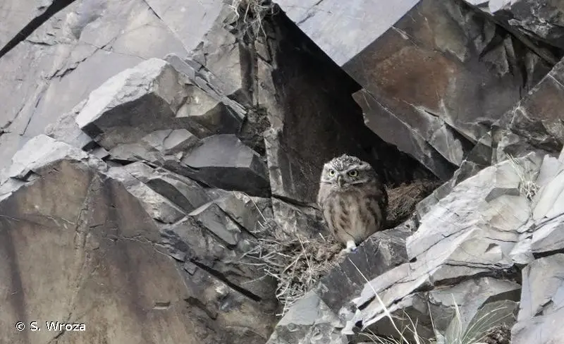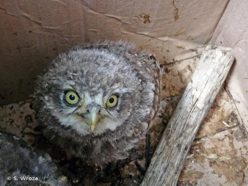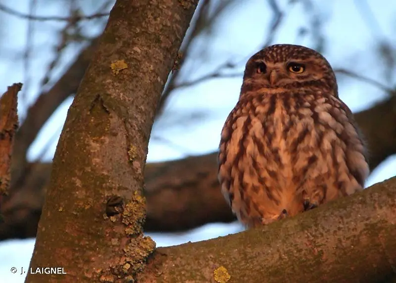 La Chouette chevêche possède un plumage brun terre sur le dessus et le dessous est blanc jaunâtre avec de larges rayures brunes, assez serrées sur la poitrine. Les pattes sont couvertes de plumes blanchâtres et les doigts parsemés de plumes filiformes. La calotte est tachetée de multiples petits points blancs et les épaules sont constellées de grosses tâches blanches.