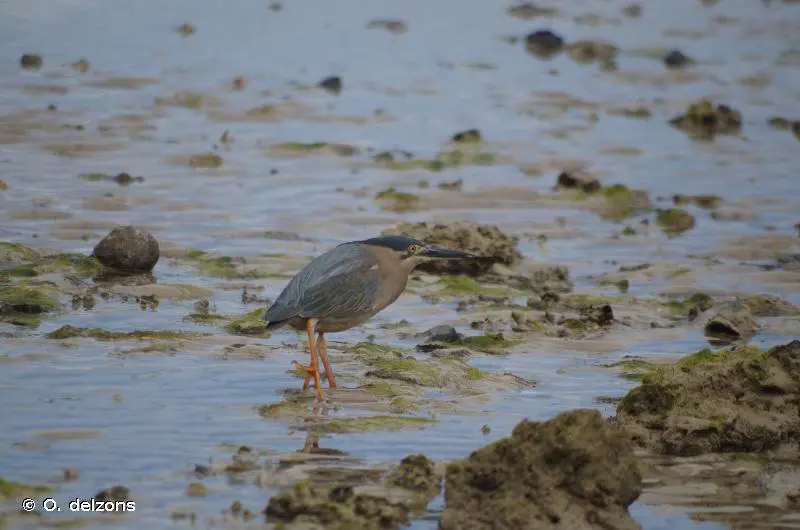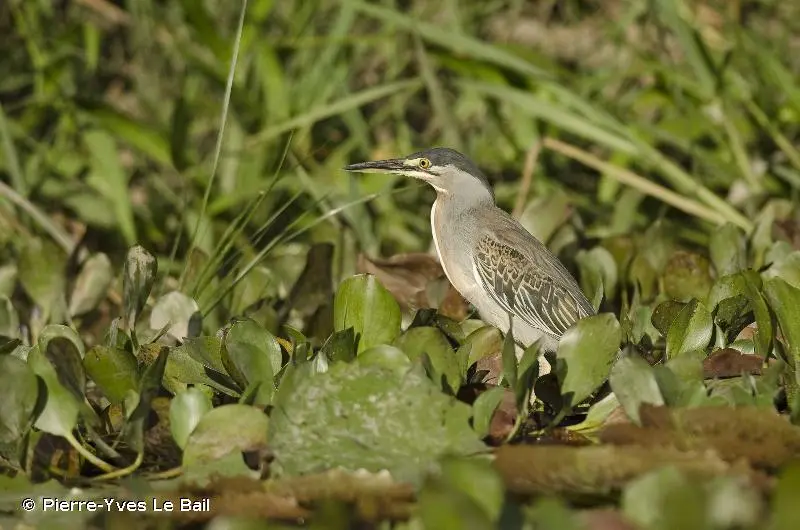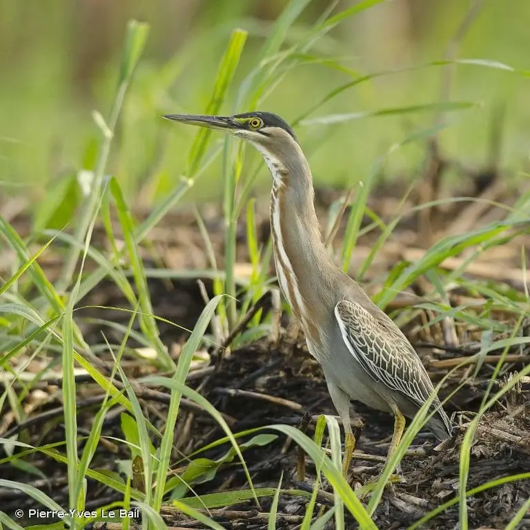 Le dessus du Héron strié est vert grisâtre, excepté les côtés. L'arrière de la tête et le cou sont gris pâle. La gorge est blanche, les côtés de la poitrine chamoisés et le reste des parties inférieures gris clair. Le bec est jaune noirâtre. Les lores sont de couleur sombre, les iris jaunes. Les pattes sont noires ou jaune verdâtre. Les femelles ont tendance à être plus petites que les mâles. Il existe un dimorphisme entre l'adulte et le juvénile, ce dernier ayant une coloration bien plus mouchetée, tachetée, moins unie, et plus brunâtre.
