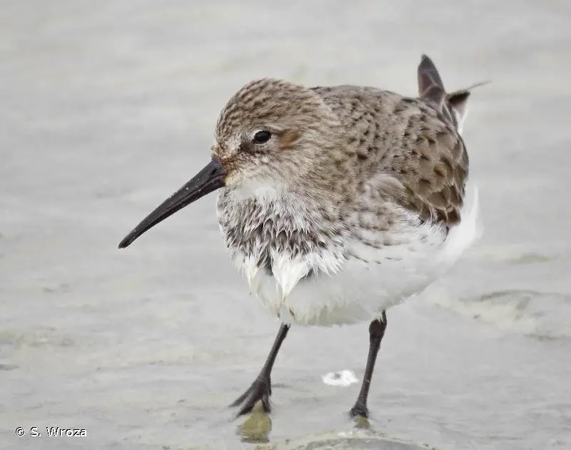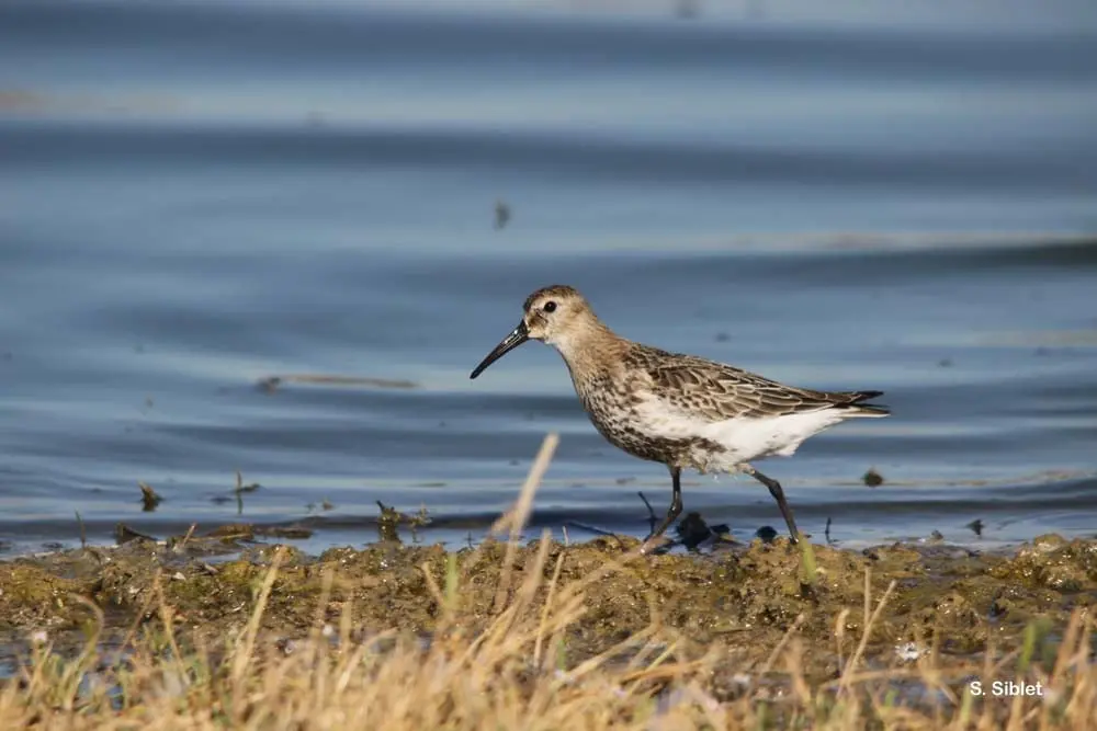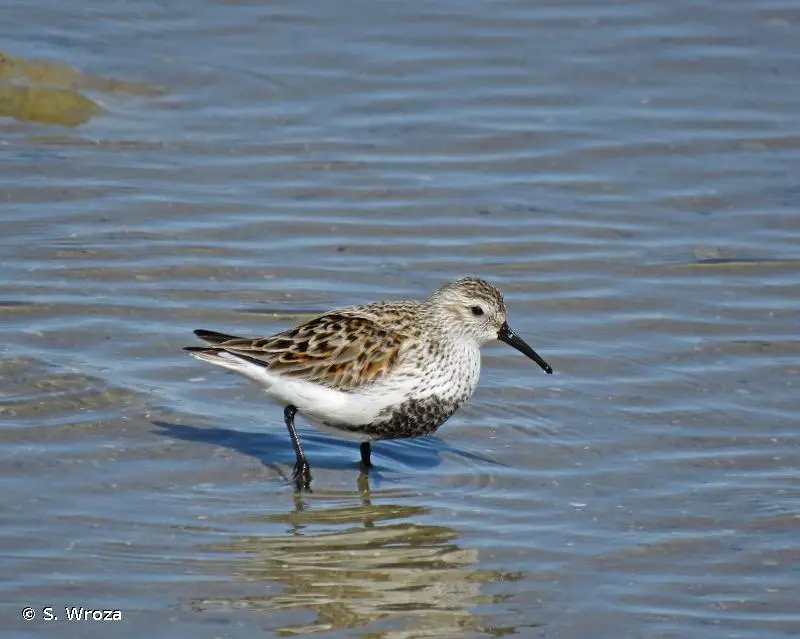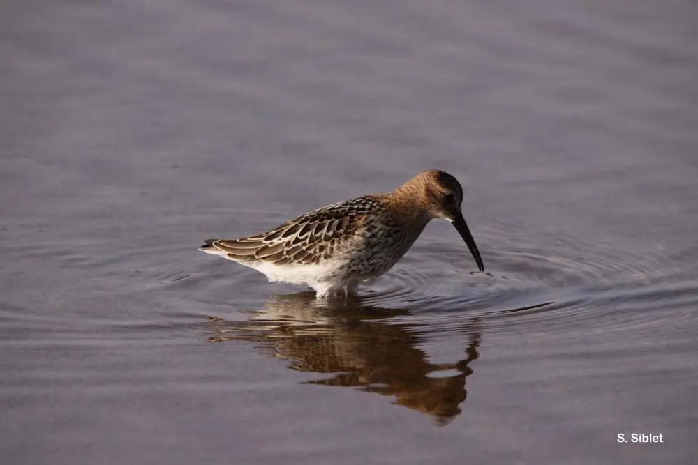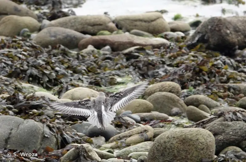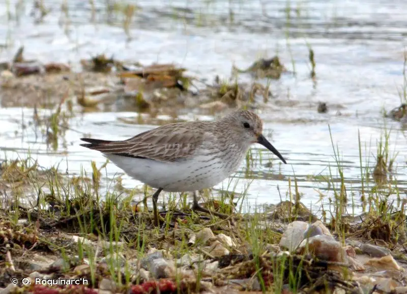 En plumage nuptial, il est facilement reconnaissable à la tache ventrale noire, la calotte finement striée de roux et de brun et les joues, gorge et poitrine plus ou moins chamois, striées de noir. En hiver, les parties supérieures sont gris-brun pâle avec un liseré blanchâtre.