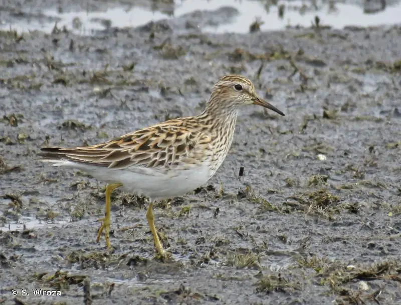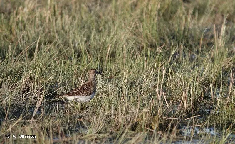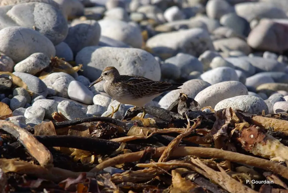 Dessus compose de plumes brunes à liseré beige et roux, formant un motif en écailles. Plus clair et plus finement moucheté sur le cou et la tête. La calotte peut être plus sombre avec un sourcil clair plus ou moins bien visible. Dessous : cou et poitrine brun gris finement tacheté de beige, ventre et sous caudales blanc. Bec fin et droit, jaune vert, plus sombre à la pointe. Les pattes sont jaune vert. En vol : fine bande alaire blanche. Croupion avec ligne sombre médiane. Les marques sont identiques, bien que plus tranchées, en plumage nuptial. Dimorphisme sexuel diffus, la femelle étant un peu plus petite.