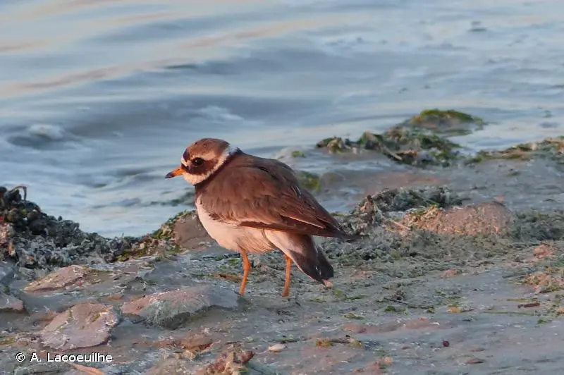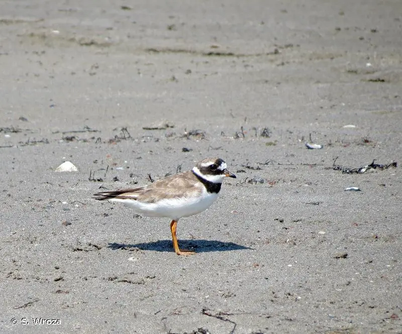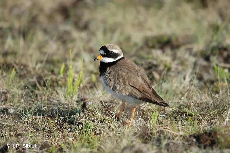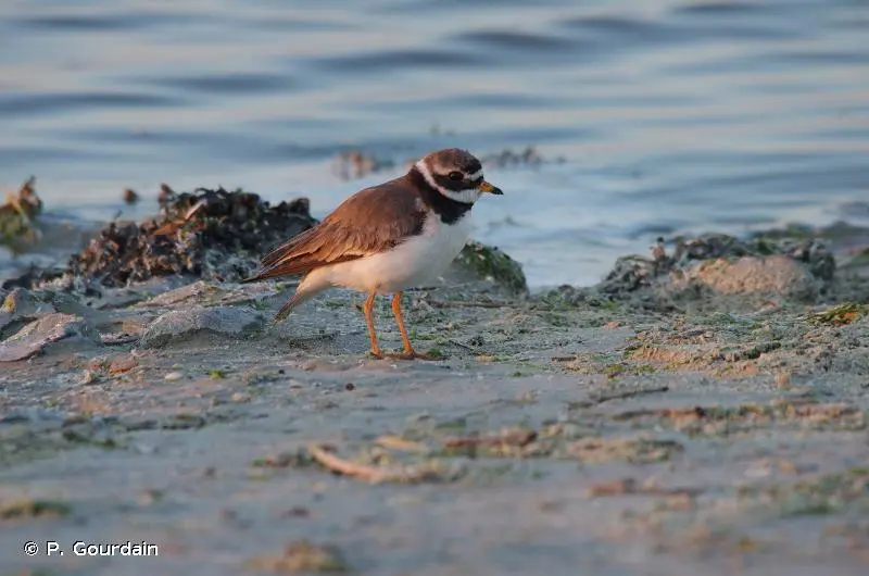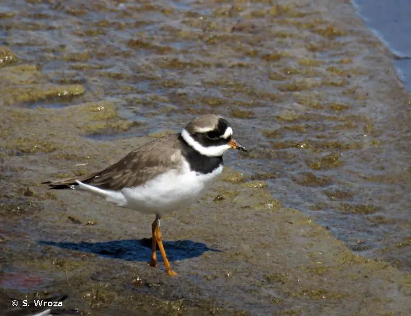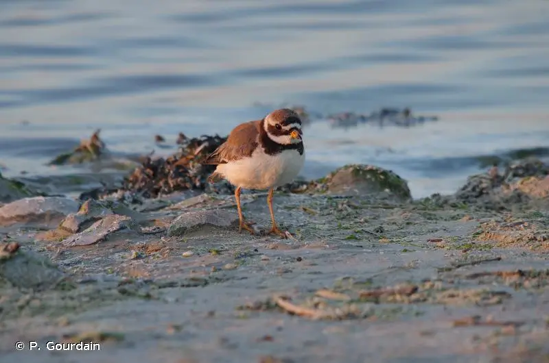 Petit limicole au plumage brun sur le dos et blanc sur la poitrine et le ventre et aux pattes orange. Collier noir proéminent, front blanc surmonté d'un bandeau noir entourant les yeux, bec orange avec la pointe noire en plumage nuptial. Une bande alaire blanche, très visible en vol caractérise l'espèce. En plumage inter-nuptial, le collier et le bandeau sont bruns et le bec noir.