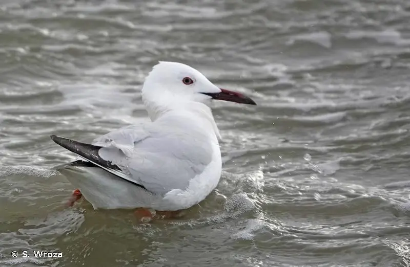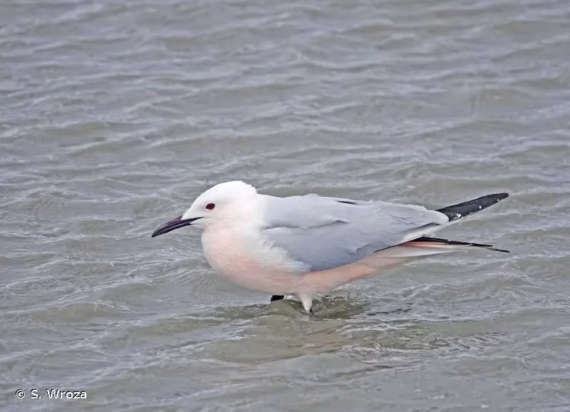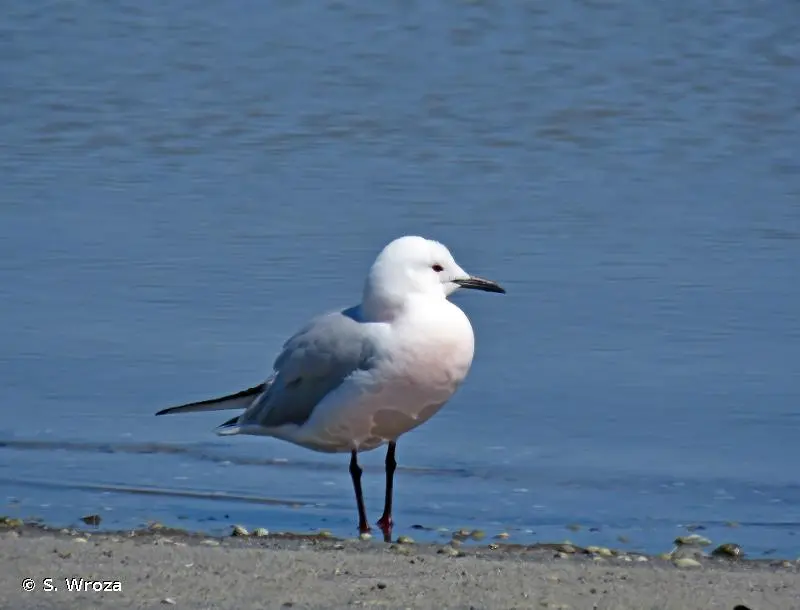 Ce goéland possède une silhouette élancée particulièrement marquée quand le cou, long pour un goéland, est tendu. La tête est blanche, le front fuyant, le bec long et assez fin. En plumage nuptial, le manteau est gris perle, la queue blanche, le ventre et le cou blancs teinté de rose, les pattes rouge vif et le bec rouge foncé.
