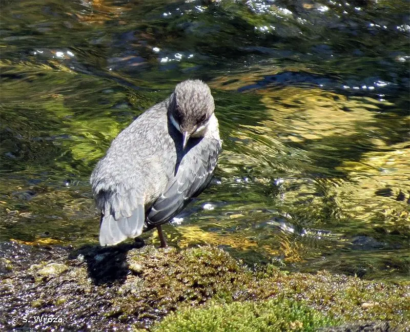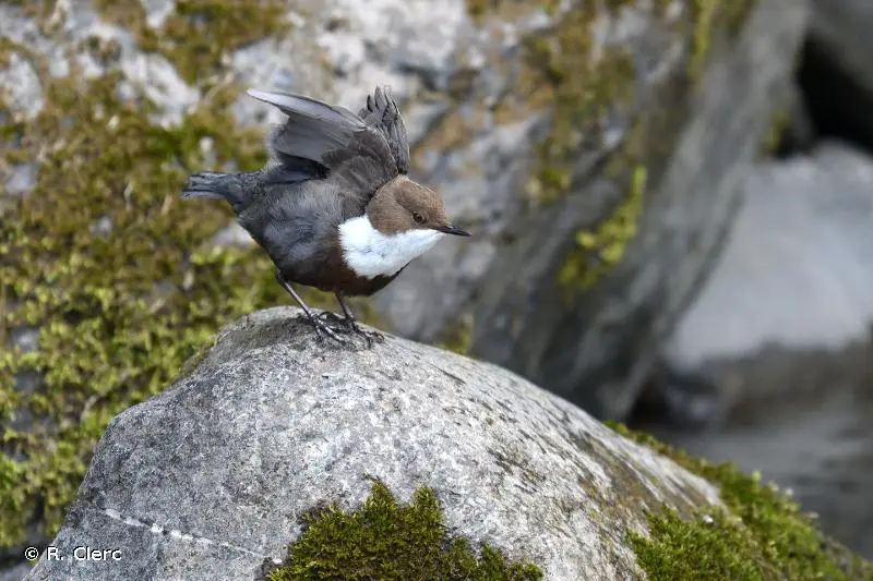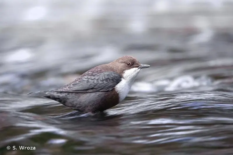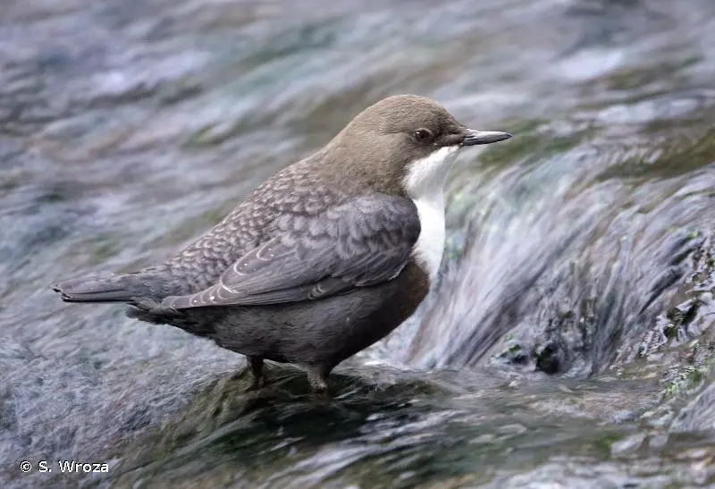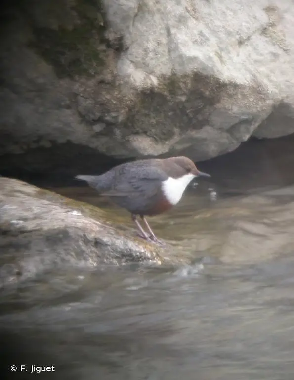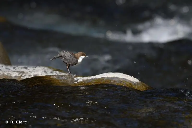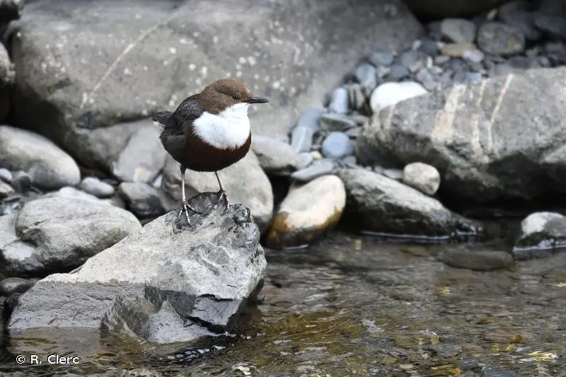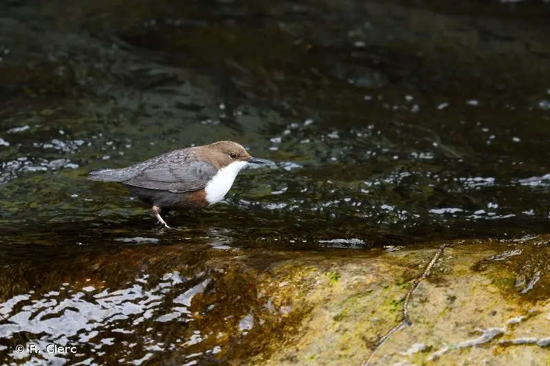 Le Cincle plongeur est un passereau au corps rondelet, à la queue courte, dont le plumage sombre peut faire penser à un petit merle. Un plastron blanc s'étendant du menton au sternum est limité par une bande rousse, parfois absente. La tête et la nuque sont marron, le reste du plumage est brun sombre à noir.