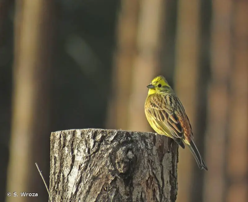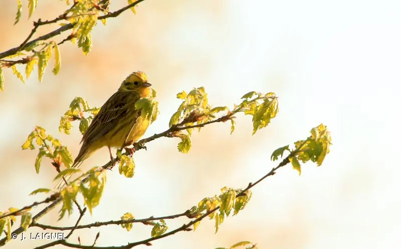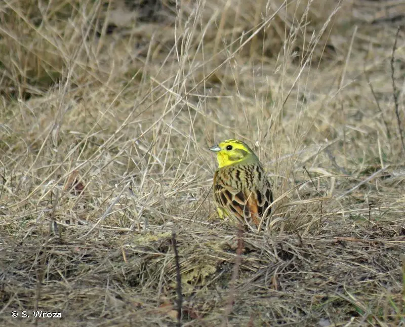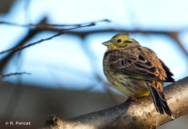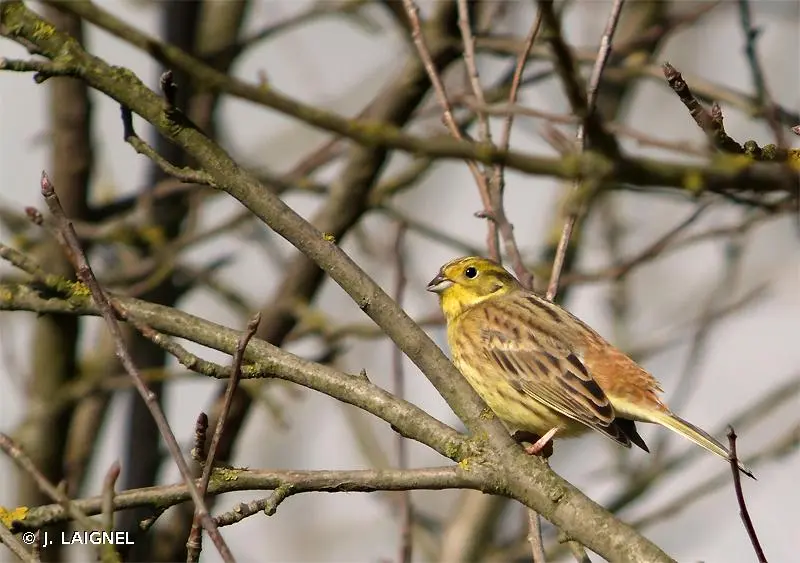 Le mâle de cette espèce est bien reconnaissable à sa tête jaune depuis le crâne strié de brunâtre jusqu'à la gorge jaune unie en passant par les joues ornées d'un croissant brun. La poitrine rousse fait transition avec le ventre jaune strié de brun comme les flancs. Le dos est brun roux moucheté de brun sombre.La femelle est plus terne, bien plus striée de brun, notamment sur la gorge et la poitrine. Le jaune est partout moins intense. Les deux sexes possèdent un croupion roux étendu très caractéristique à l'envol. Le chant est une sorte de stridulation aiguë caractérisée par un decrescendo final un peu triste.