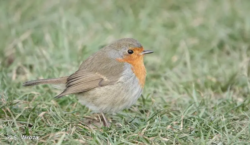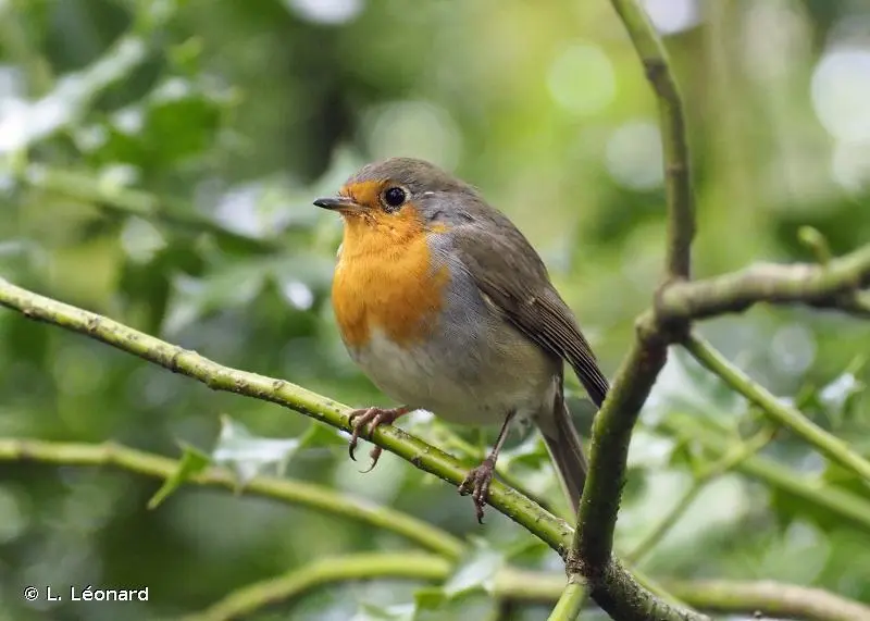 Passereau caractérisé par sa poitrine et sa face orange. Les parties supérieures, les ailes et la queue sont brun verdâtre et les parties inférieures sont claires. Le tour du plastron et de la face est marqué d'une bande grise.
