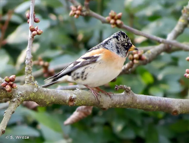 Le mâle adulte a la poitrine et les épaules roux orangé. Le haut du dos et les côtés de la tête et du cou sont d'un noir brillant grisâtre en hiver, voilé par des bordures roussâtres. Le bas du dos et le croupion sont blancs. La femelle est plus terne. L'orangé est plus pâle et les côtés de la tête sont plus gris.