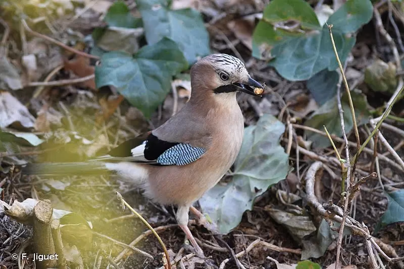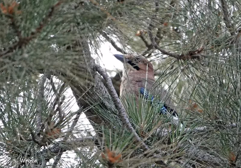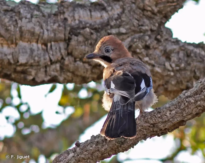 La coloration générale du plumage châtain à fauve pour les tectrices et les petites couvertures, mais surtout les fines rayures bleu, noir et blanc couvertures primaires et des grandes couvertures sont les critères distinctifs de cette espèce.. Il présente une calotte striée de noir et une gorge claire cernée de part et d'autres par une large moustache noire. Les rémiges et rectrices sont globalement sombres. Le vexille externe des rémiges est marqué de blanc et forme un miroir sur les ailes lorsque l'oiseau est posé. Le croupion est également blanc. L'espèce trahit souvent sa présence par un cri d'alarme caractéristique avant de s'envoler.