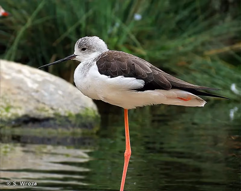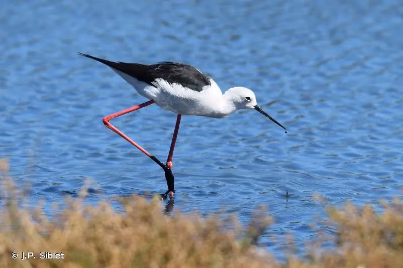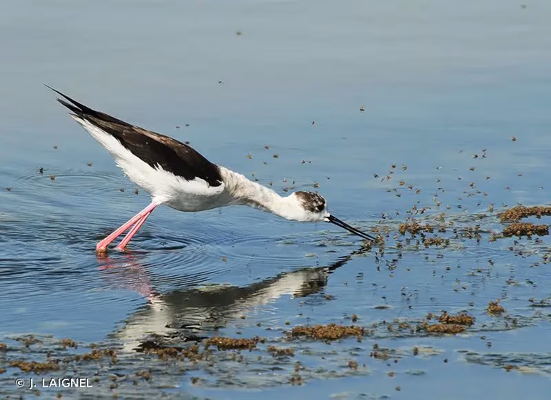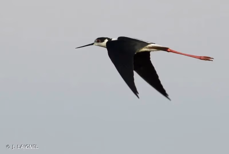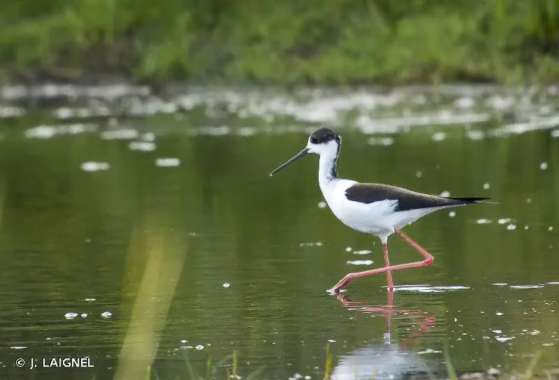 L'échasse blanche a le plumage noir et blanc, avec les ailes, l'arrière du cou et le haut du dos noir. Tête blanche avec le sommet de la calotte noire. Un collier blanc fait contraste entre le dos et la nuque noirs. Les parties inférieures sont blanches. Cou long, yeux rouges et bec long et fin, qui est droit et noir. Très longues pattes rougeâtres à rose. Les femelles sont brunâtres alors que les mâles sont plus noirs avec reflets verdâtres. Les juvéniles sont plus clairs que les adultes.