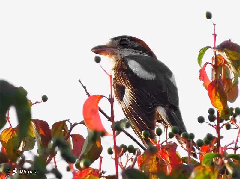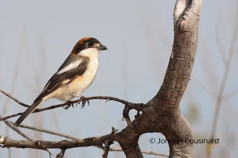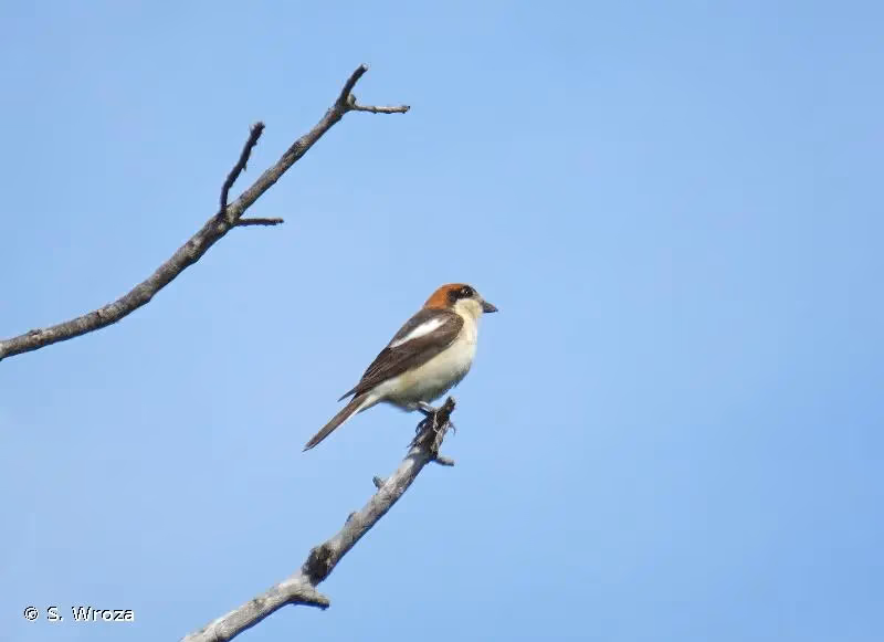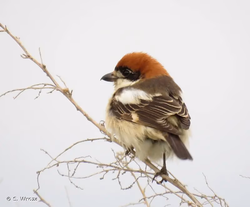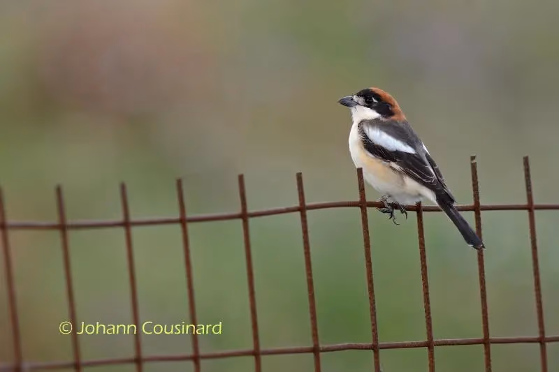 A peine plus grande que la Pie-grièche écorcheur Lanius collurio, la Pie-grièche à tête rousse est un passereau de taille moyenne, à la silhouette de petit rapace en miniature. Elle est facilement identifiable à son 'bonnet' roux et à sa gorge et son ventre immaculés. Son front est traversé par un large bandeau noir. Le manteau est noirâtre, avec le croupion blanc et une grande tache blanche sur chaque épaule (formant un V blanc vu de dos). Une autre caractéristique est la présence d'une courte barre alaire blanche, mais celle-ci est toutefois absente chez la Pie-grièche à tête rousse de Corse, Lanius senator badius.