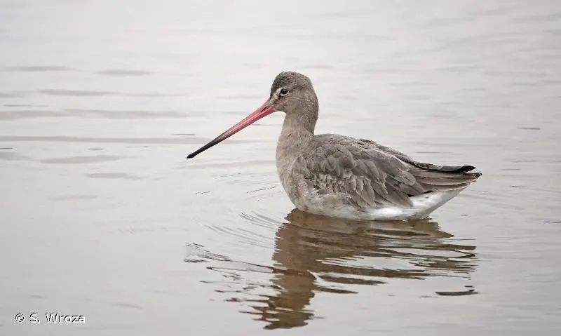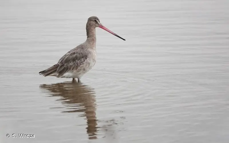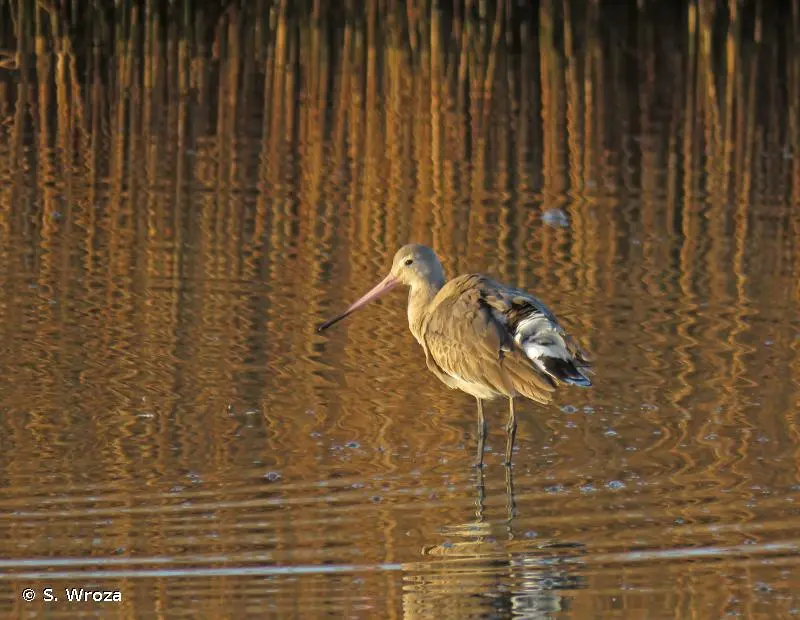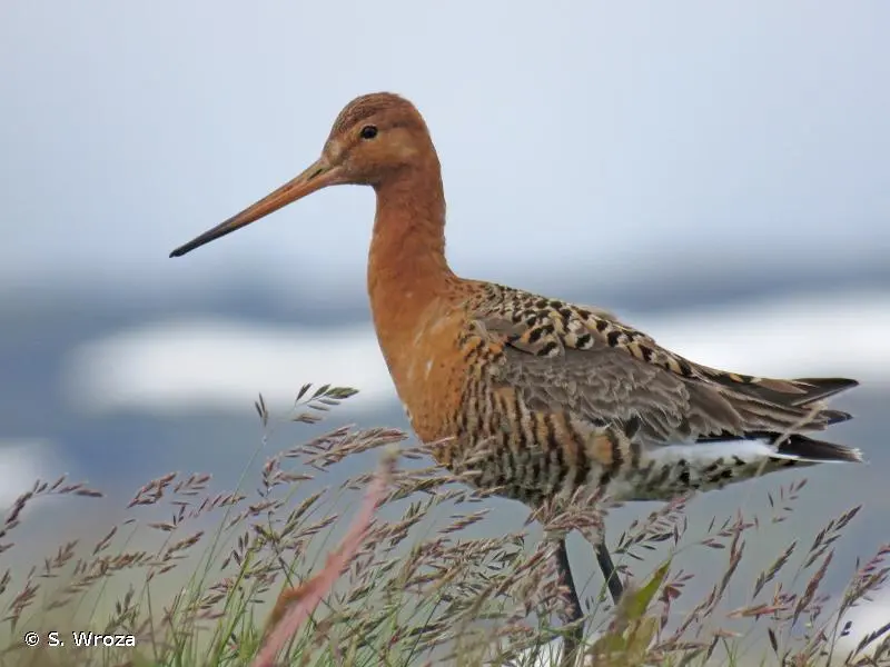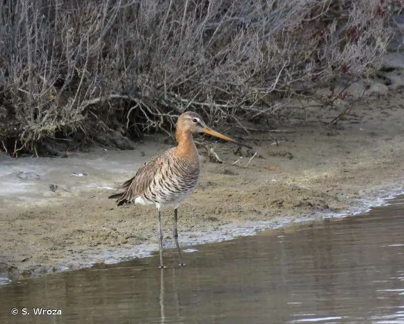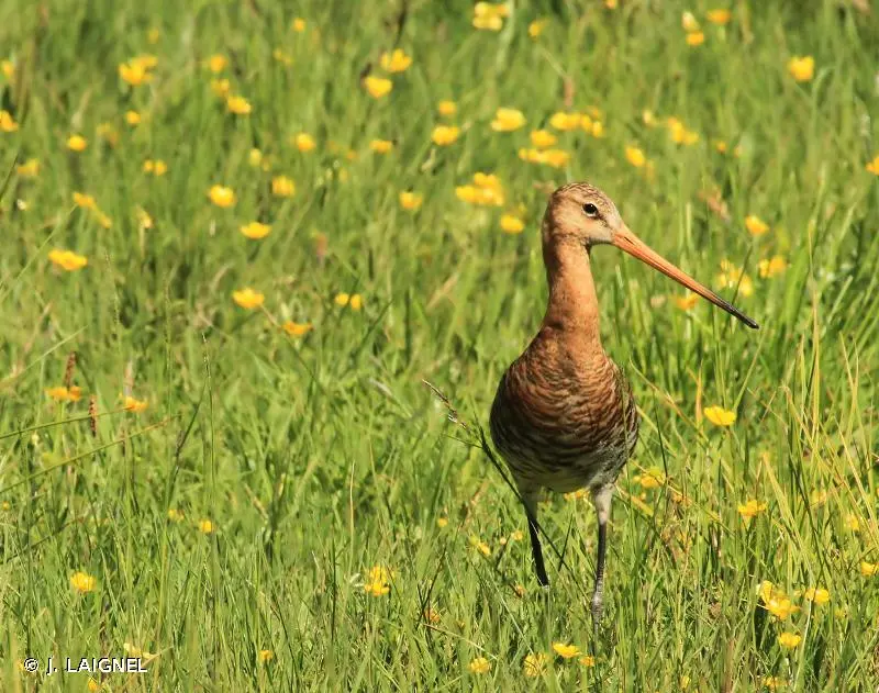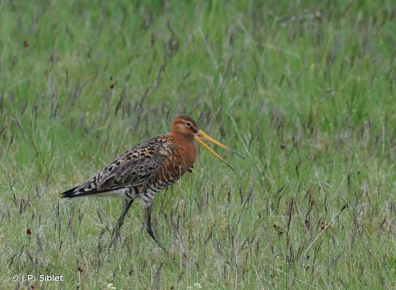 La Barge à queue noire est un limicole d'assez grande taille. En plumage nuptial, le cou et les joues sont orangés, la poitrine, de même teinte, est barrée horizontalement de stries foncées. Le ventre et les sous-caudales sont blancs. Le bec est très long, très légèrement incurvé vers le haut. En plumage inter nuptial, le plumage est à dominante grise. La queue est blanche à la base, contrastant avec le noir de sa partie terminale, cela quelle que soit la saison.Détermination :