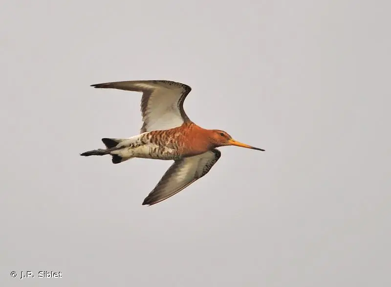 La Barge rousse (Limosa lapponica) est un peu plus petite et moins haute sur pattes, son bec est plus court et davantage incurvé vers le haut. En vol, le noir et blanc de la queue et la large bande alaire de la Barge à queue noire la distinguent de la Barge rousse dont la teinte générale est plus uniforme et dont le croupion blanc remonte en pointe sur le dos.