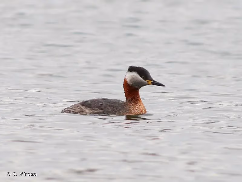 En plumage nuptial, l'adulte présente un cou et une poitrine roux, le menton, les joues et le haut du cou gris cendré, une calotte noire, descendant sous les yeux et formant une petite huppe à l'arrière. En plumage inter-nuptial, les joues, le cou et la poitrine deviennent beige crème sale, surtout sur les joues.