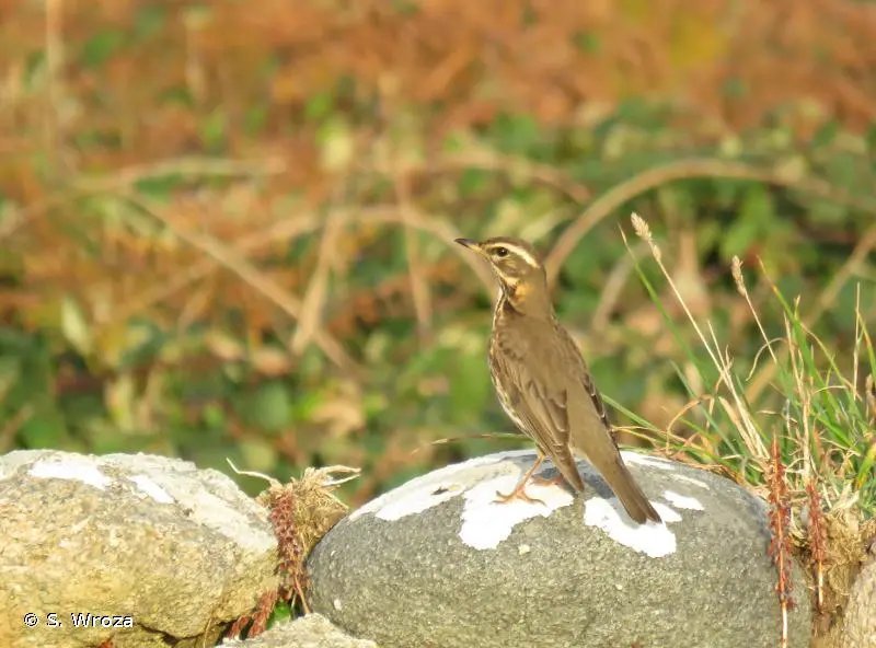 Oiseau de taille moyenne, un peu plus petit qu'un Merle noir. La tête présente un très net sourcil blanc crème. Ce caractère la distingue de toutes les autres espèces de grives présentes régulièrement en France. Les couvertures sous alaires et les flancs sont d'un roux tirant sur le rouge. La poitrine crème blanchâtre est marquée de stries noires plus ou moins diffuses.