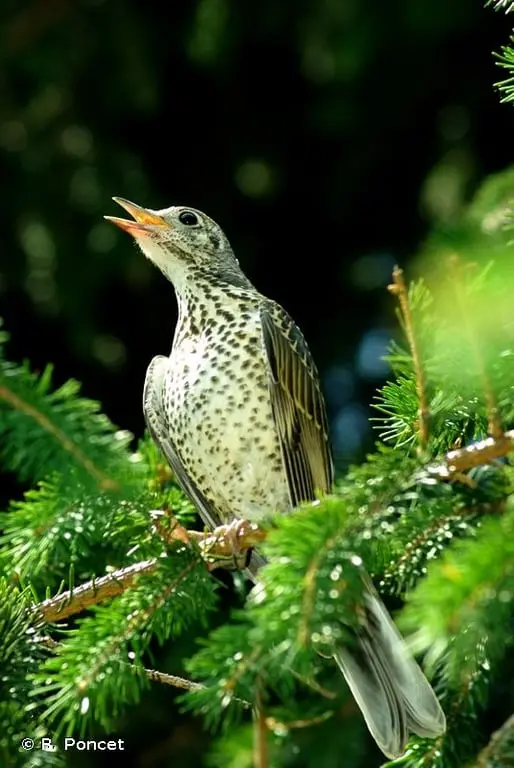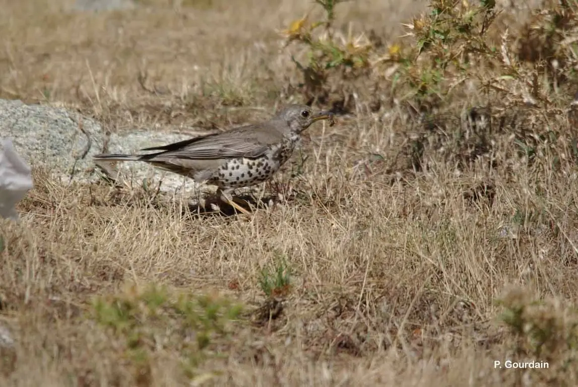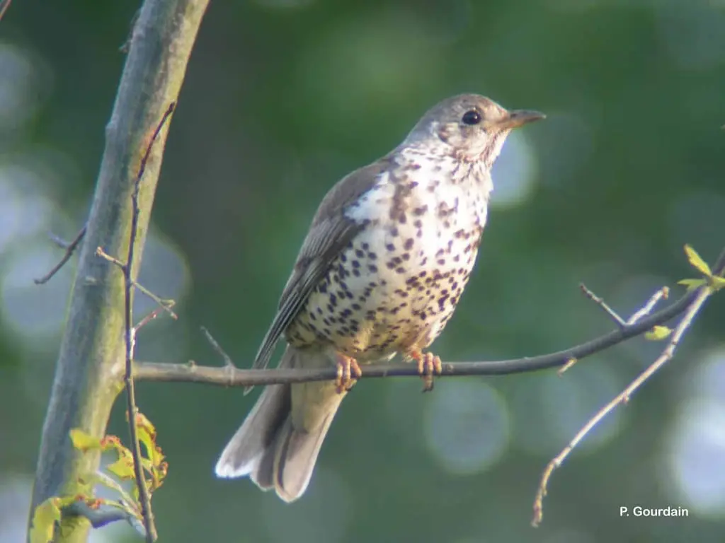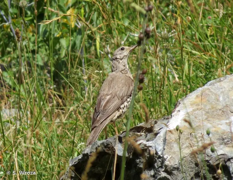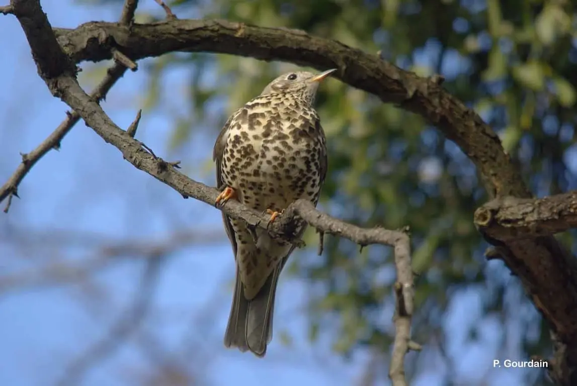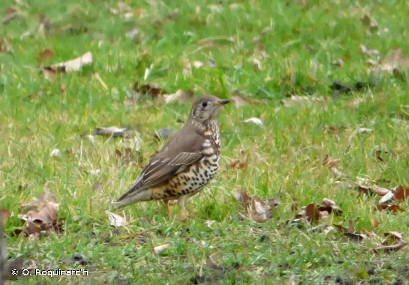 C'est la plus grosse grive d'Europe. Le dessus est gris brun pâle, la poitrine, le ventre et les flancs sont blanchâtres, très fortement marqués de taches noires. A l'envol, les coins de la queue sont blancs. Le chant, lent et mélodieux, est une série de courtes phrases répétées. Le cri le plus fréquent, caractéristique de l'espèce, est un son de crécelle appuyé et qui s'entend de loin.